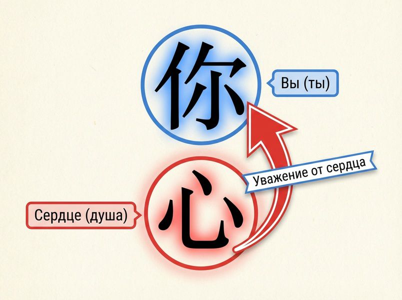 Сама структура иероглифа 您 символизирует уважение на визуальном уровне. Он состоит из двух частей: