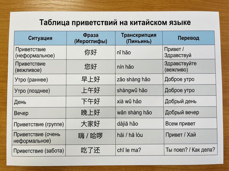 你好 (nǐ hǎo) — это универсальный солдат в мире китайских приветствий. Транскрипция на русском — «ни хао». Это самый безопасный и распространённый способ поздороваться, если вы не уверены в статусе собеседника или ситуации.