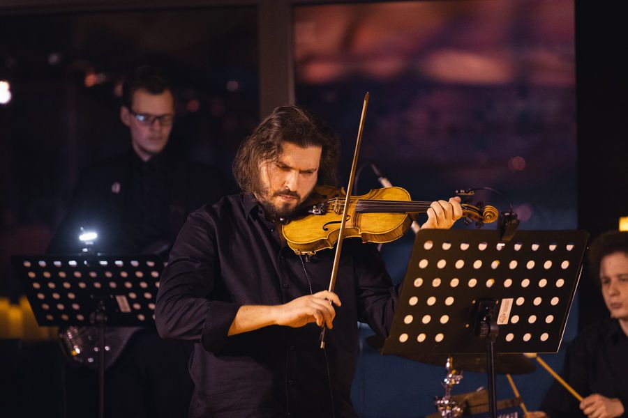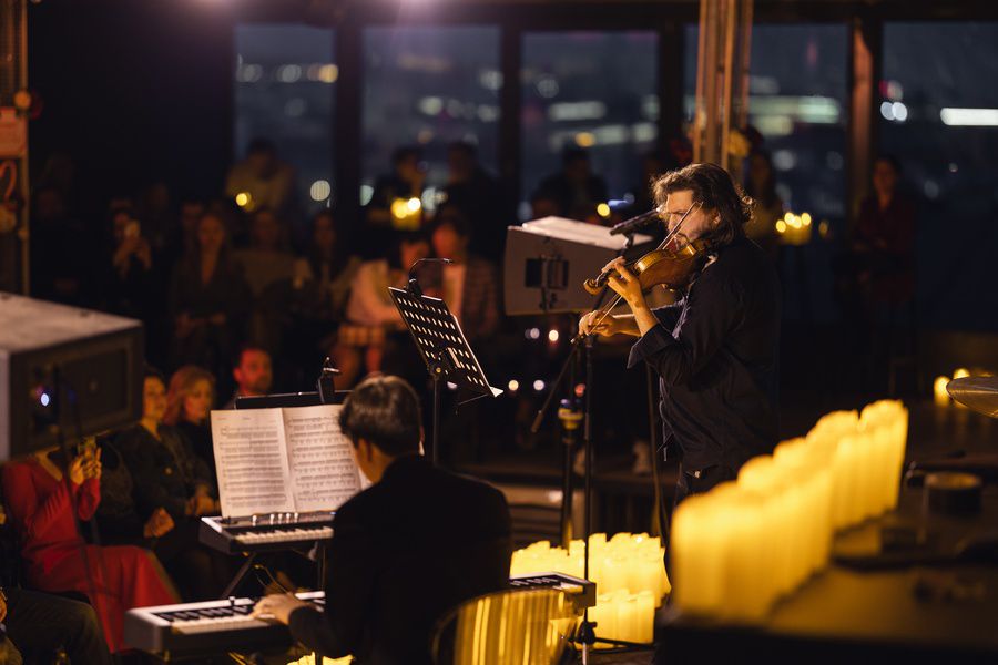 Концерт проходит на тёплой крыше с панорамным видом на город. За стеклом вечерняя Москва мерцает огнями, а внутри звучит музыка, которая словно открывает новые миры. Камерная атмосфера, живые инструменты и мягкий свет создают пространство, где можно остановиться, выдохнуть и полностью погрузиться в музыку.