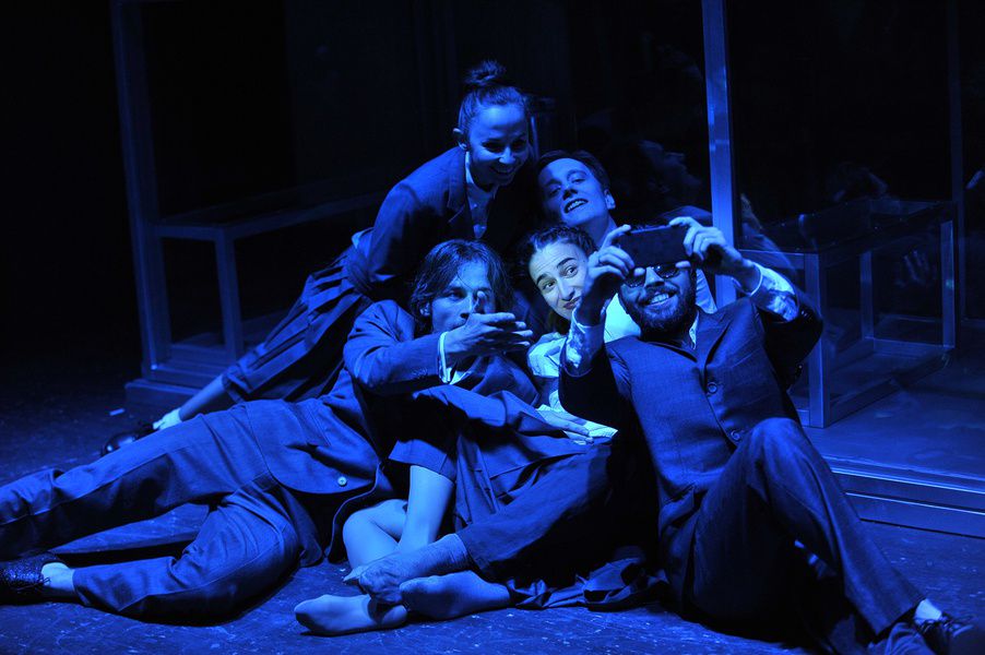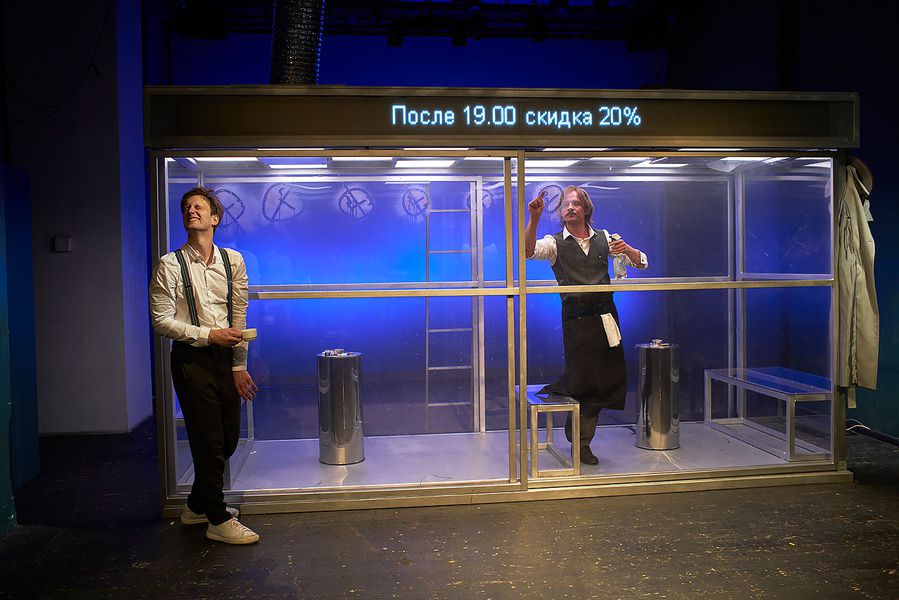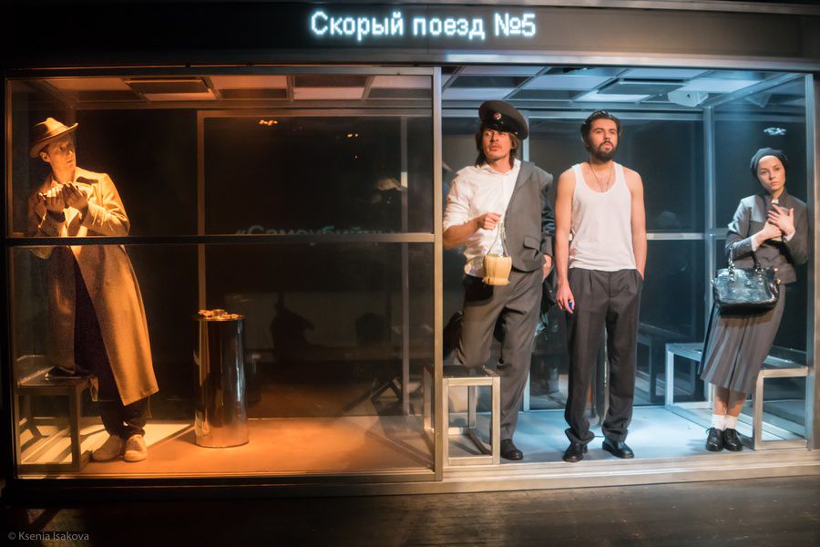 В спектакле занято пять артистов, каждый из которых исполняет до семи ролей. В роли Героя — Юрий Титов.