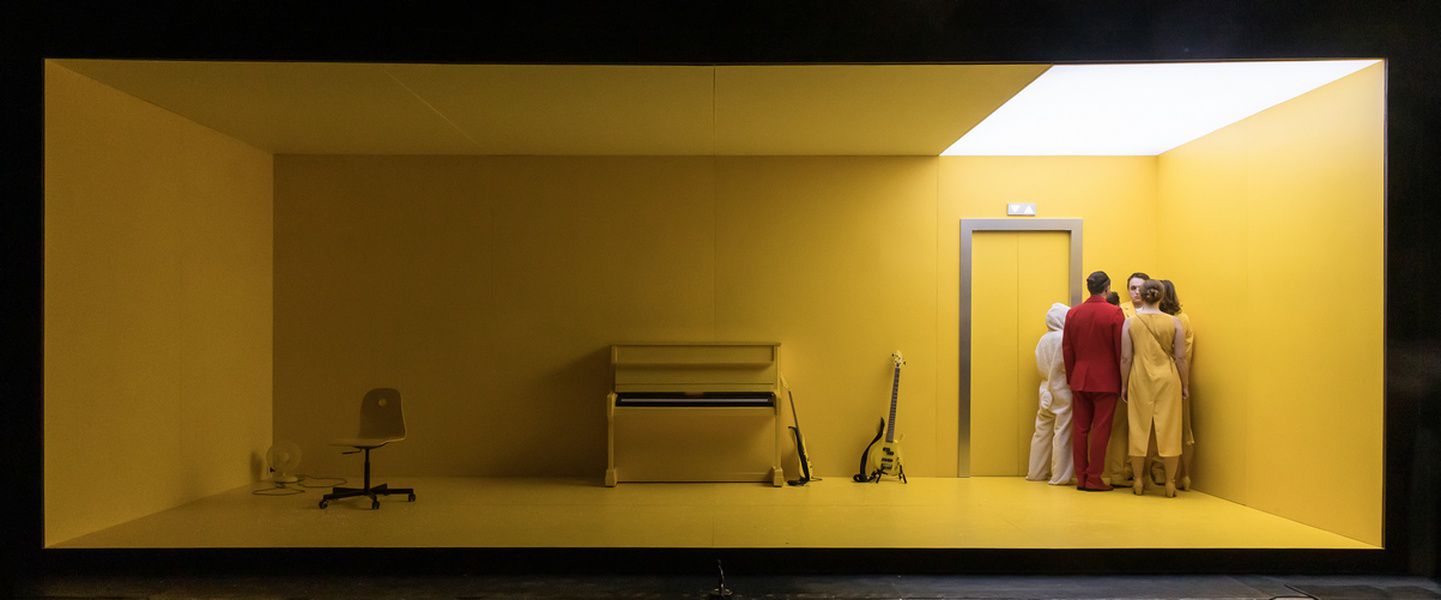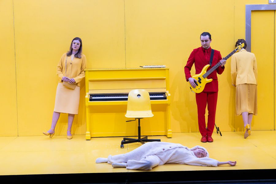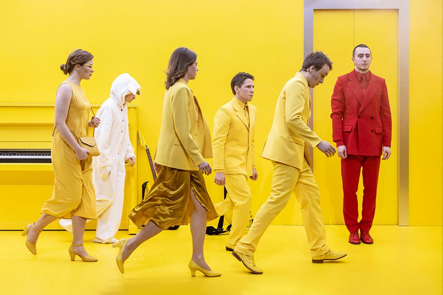 Сценическое решение строится на выразительном цвете: пространство, предметы и костюмы окрашены в насыщенный жёлтый. Вход в мир воспоминаний обозначен единственным ярко-синим лифтом, ведущим в скрытую комнату. Образ Капитана Крюка возникает как тень и противоположность героя — в строгом красном, связанном с детским страхом.