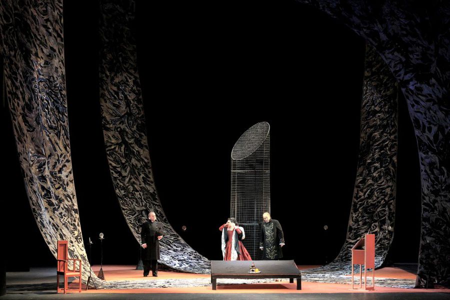Важен и фон отраженных исторических событий: перед зрителями Италия, в которую вторглись войска Наполеона. Особенное внимание уделено метафоричному соотнесению настроений героев через окружающий мир: художественное оформление спектакля включает видеоряд из трёх цветов, транслируемый в глубине сцены. Оттенки белого, красного и чёрного становятся отражением каждого акта. Так, в момент музыкальной и драматической передачи любви Тоски и Каварадосси доминирует белый цвет, символизируя безоблачное счастье героев. Однако в сценах пыток во дворце Скарпиа атмосфера нагнетается ореолом красного цвета — цвета крови. Смерть Каварадосси и Тоски знаменуется мрачностью чёрных оттенков. Режиссёрской находкой можно назвать и символическую фигуру женщины, которая в давящем безмолвии открывает каждое действие.