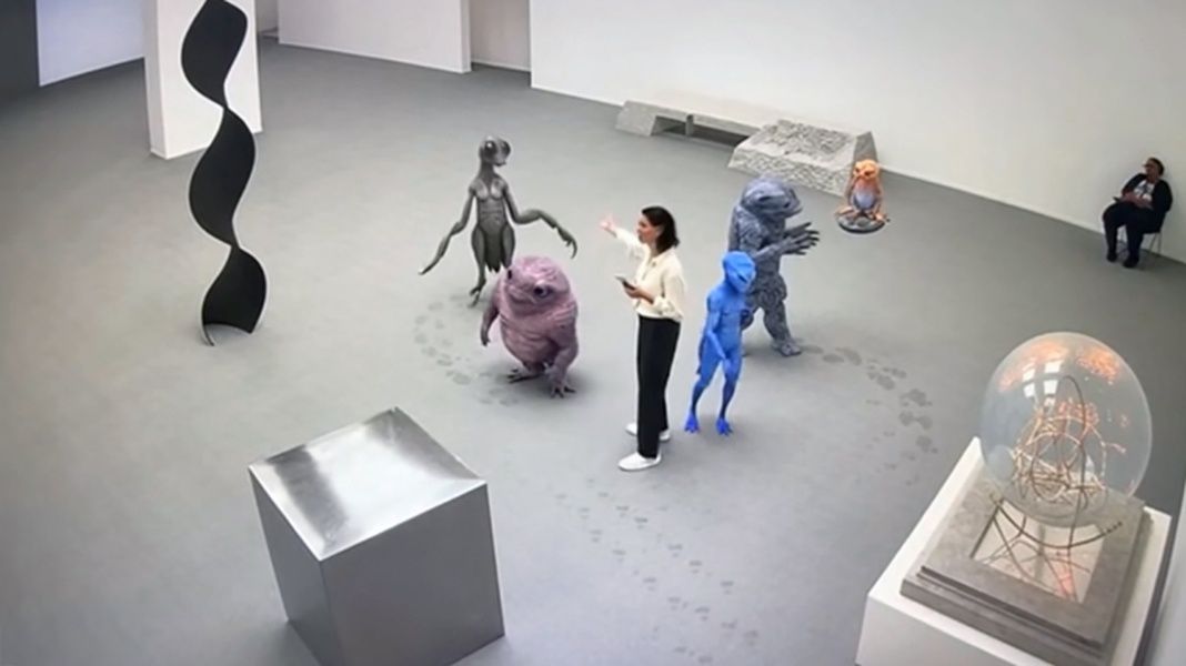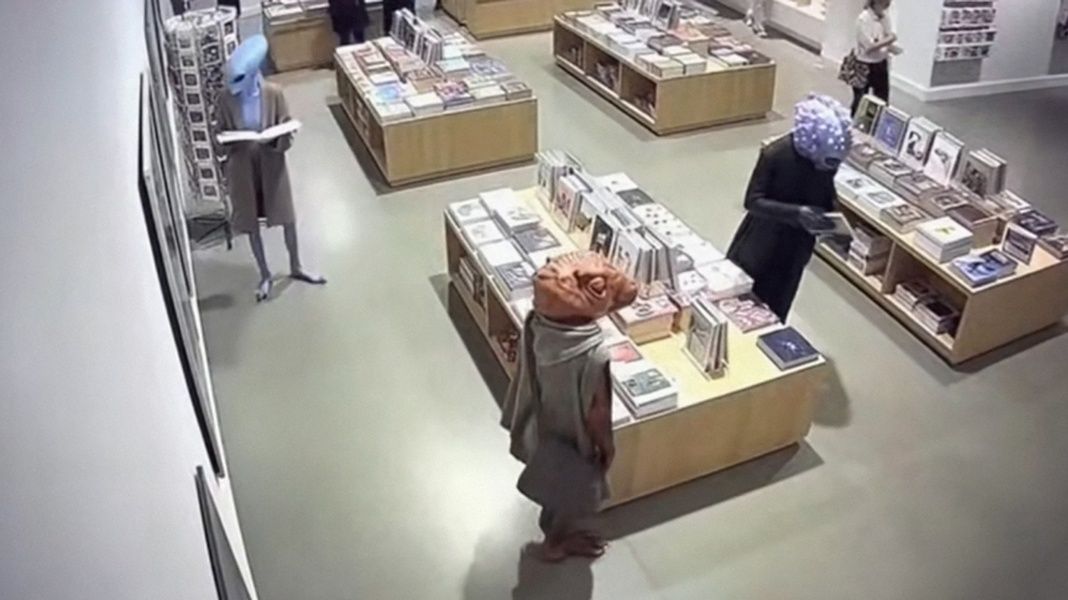 Работа выстроена как реконструкция поста охраны в музее современного искусства. Перед зрителем — стол, экраны, записи камер видеонаблюдения и ощущение полной включённости в чужую систему контроля. Но очень быстро знакомая музейная ситуация начинает смещаться: среди посетителей появляются инопланетные существа, которые ведут себя почти так же, как люди, и с тем же вниманием рассматривают экспозицию.