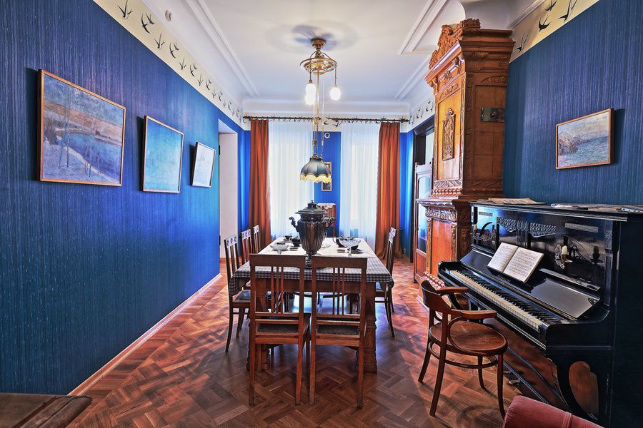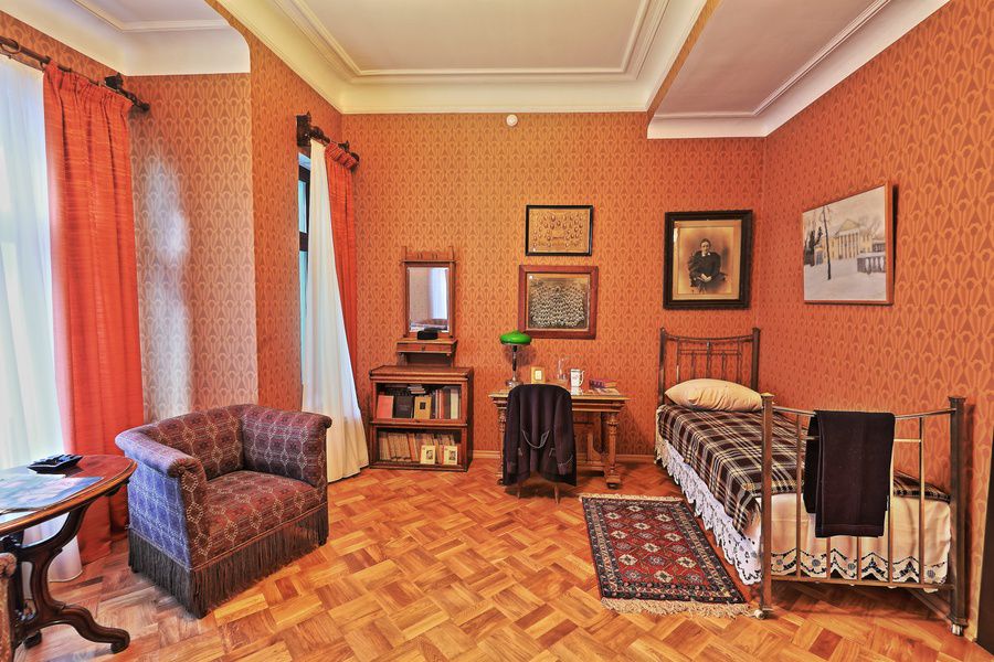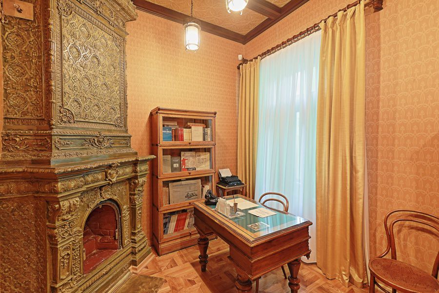 Все предметы интерьера и обстановки аутентичны. На своём привычном месте стоит сундук для вещей, висит верхняя одежда Глеба Максимилиановича, портфель, трости.