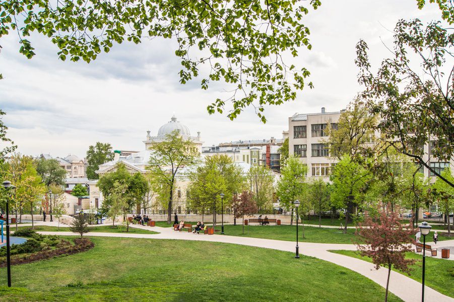 На детских площадках установлены необычные тренажёры и элементы для игр: «паутинка-лазалка» в виде космической летающей тарелки, слайдер и оригинальные качели. Появление космических мотивов связывают с именем знаменитого писателя-фантаста Ивана Ефремова, который жил в одном из соседних домов. Есть здесь и историческая достопримечательность: фрагмент стены XVIII века, который был откопан в ходе реконструкции парка. Его поместили под стекло и превратили в часть парковой инсталляции. Также на территории парка располагается памятник Осипу Мандельштаму и «Стена плача» (благодаря соседству с хоральной синагогой).