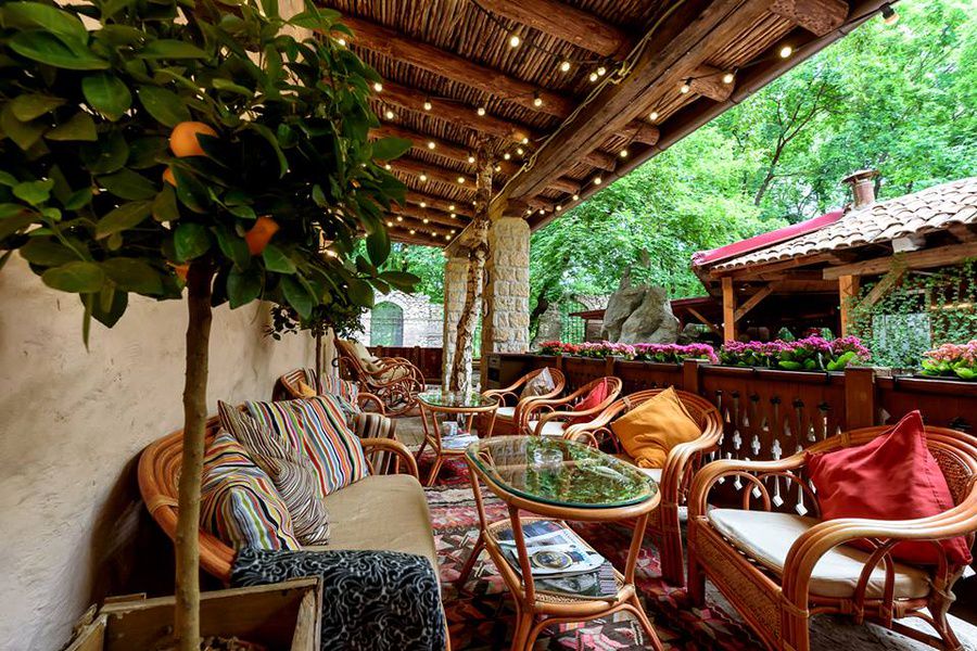 Свежий воздух и пение живых птиц — прерогатива веранды ресторана. Изюминкой данного места является настоящий пруд с форелью, которую, по желанию гостя, можно сразу же приготовить к обеду или ужину.