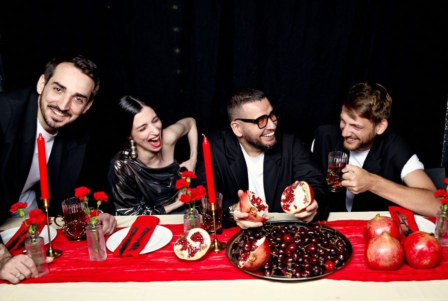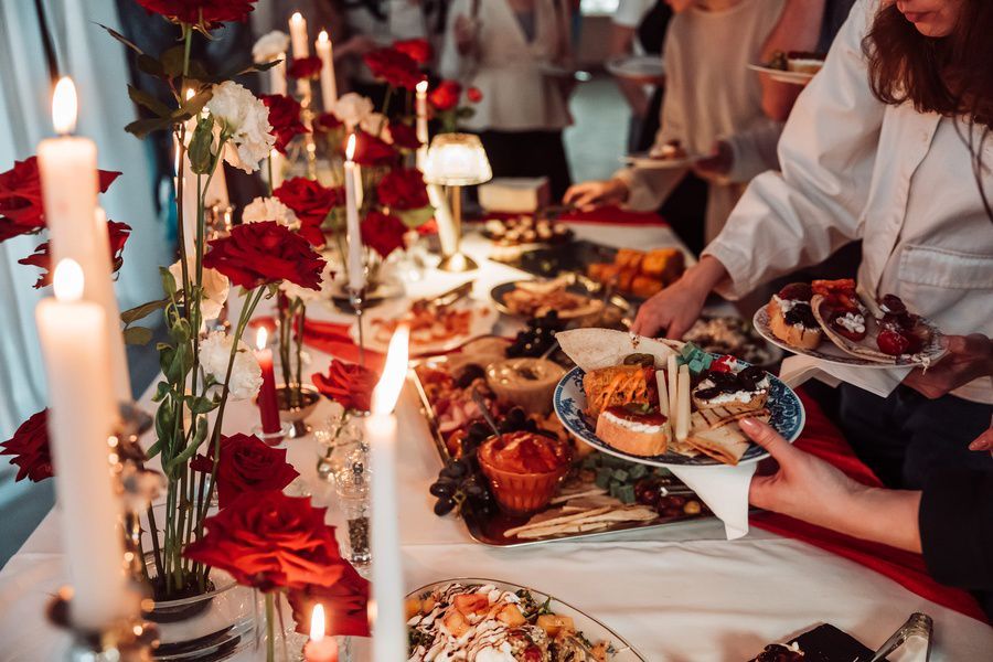 В меню вечера: тарталетки с жюльеном и цыплёнком, мини-веллингтон (уменьшенная версия английского блюда из говядины), подкопчённый беби-картофель с овощами гриль, сырно-мясное ассорти, пряные оливки в лаймовом маринаде, канапе из пармской ветчины с карамельной грушей, кростини (итальянская закуска) с томатами и сыром страчателла, профитроли дорблю, салат «Янгилик», десерт «Павлова» со вкусом манго и маракуйи.