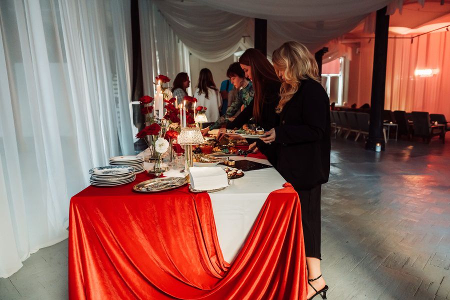 Для каждого мероприятия разрабатывается эксклюзивное меню фуршетных блюд, которое вместе с приветственными напитками уже входит в стоимость вечера. Выступление комиков пройдёт в зале с театральной рассадкой, где рядом с каждым из мягких кресел будет размещён столик для блюд и напитков.