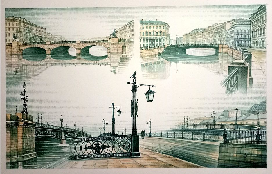 При этом художник не растворяет городской облик в одной лишь атмосфере. За дымкой и приглушёнными переходами проступает строгая и ясная структура Петербурга — дворцы, соборы, храмы, шпили, линии набережных и изгибы мостов. Именно в этом соединении лирической зыбкости и графической точности возникает главное напряжение экспозиции.