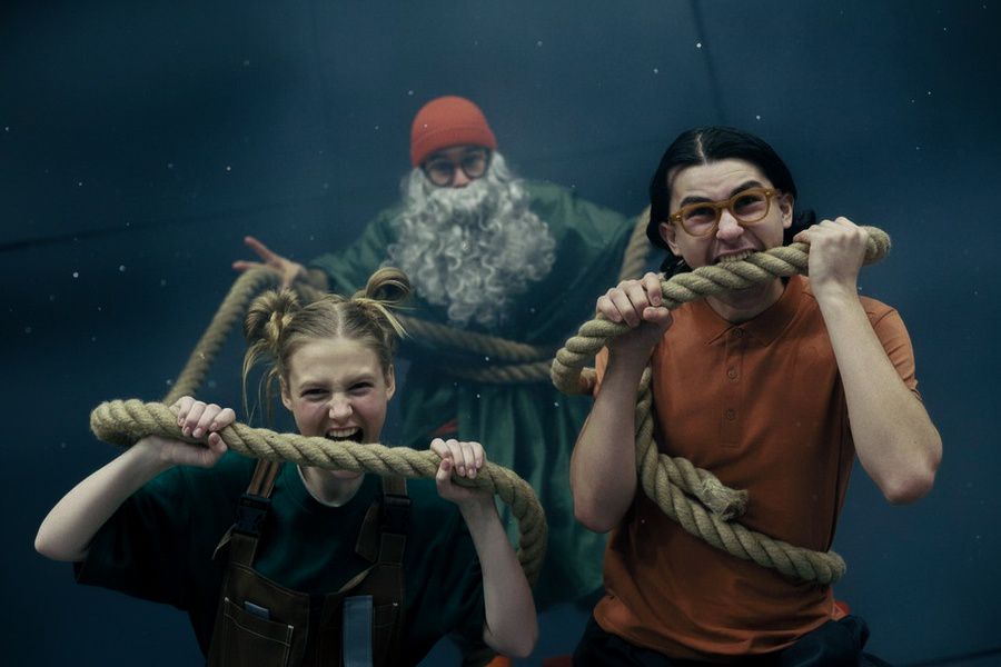 Герои выкрикивают нечленораздельные звуки, кричат, кувыркаются, громко хлопают в ладоши, топают, дерутся друг с другом, кидаются подушками, распыляют снег, случайно чмокают друг друга в губы и в щёки и много чего ещё. Поначалу всё происходящее на сцене может показаться очень странным и непонятным, а от героев ненароком будешь ждать, мол, когда же они заговорят. Однако универсальный язык пантомимы приводит эту визуально сложную, но нарративно простую историю к общему знаменателю: от неё невозможно оторвать глаз в любом возрасте.