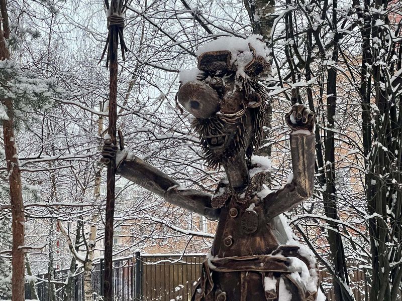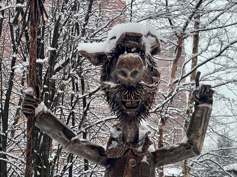 Всклокоченный старичок стоит на камне в одном из дворов и пытается что-то рассказать нам. В руке его веник, к которому вместо прутьев привязан букет роз. Большинство людей узнают в нём дворника из мультфильма «Падал прошлогодний снег».