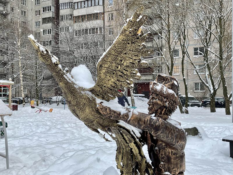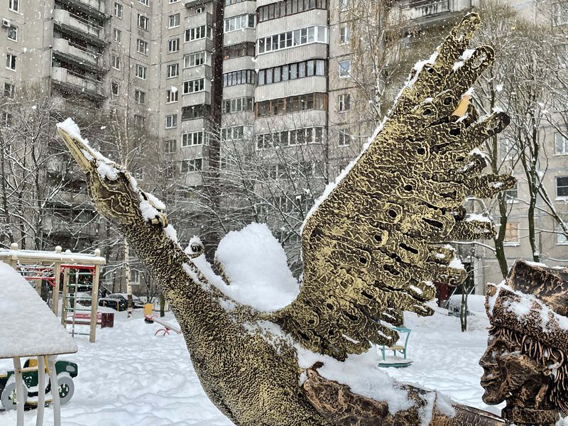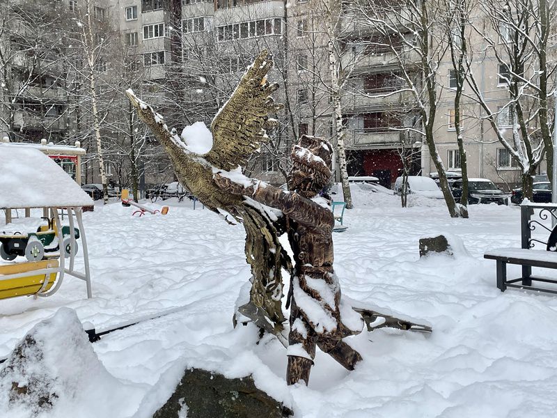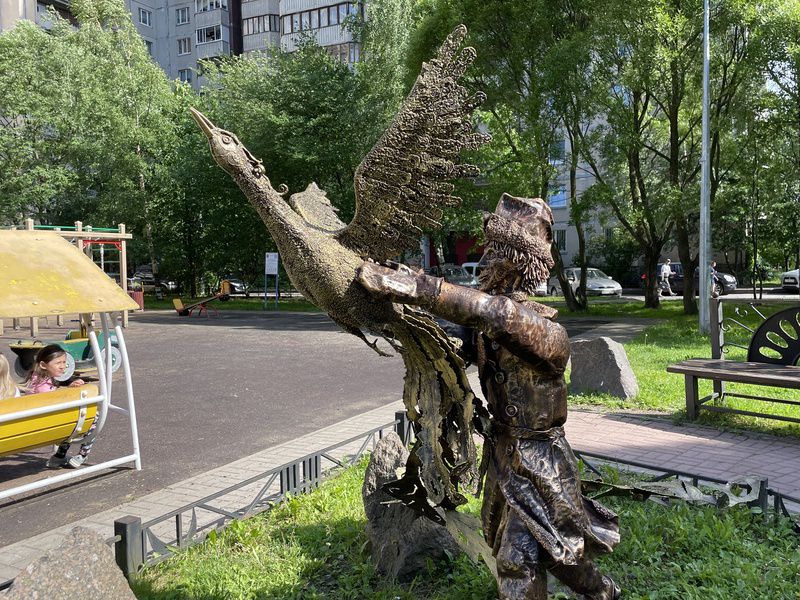 Его скульптурами украшен не один коломяжский двор. Во время прогулки по району, внимательный взгляд натыкается то на кованую композицию «Аллея новорожденных», то на скульптуры «Золотая рыбка», то на «Дракона», то на «Дворника». В спальных районах художнику есть, где разгуляться.